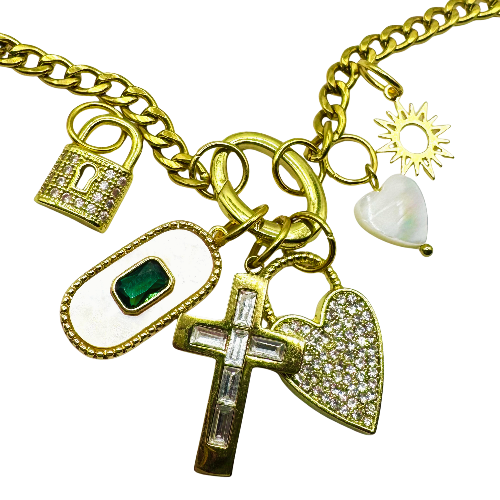 Which charms will you add to this necklace? The oval portion has a push open spring latch for adding charms, and for clasping the front closure necklace. The chain is curb link style, made of non tarnish stainless steel, and coated with real 18k gold. 18” long. Can customize length by special request!